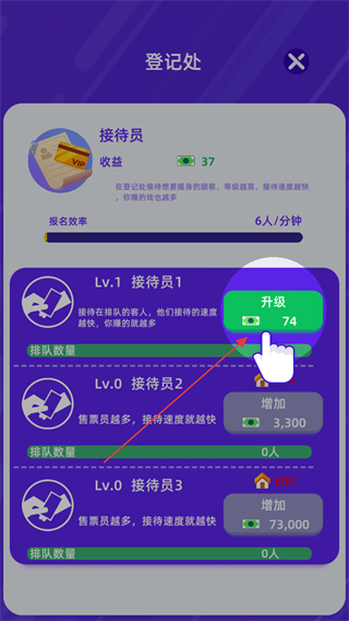 2、在登记处界面,点击升级按钮,消耗一定资源升级接待员,提升接待效率和收益。