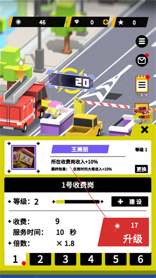 2、点击界面上的收费岗,查看员工王美丽信息,花费资源点击升级来提升收费岗属性。