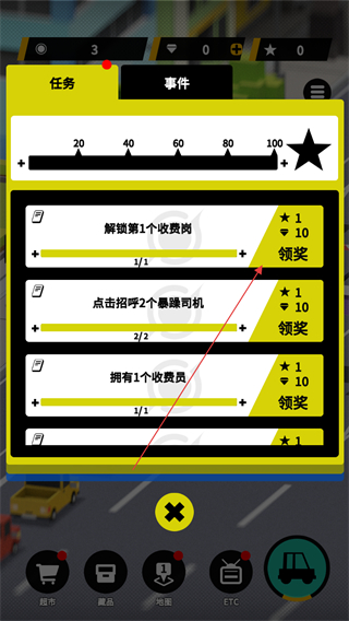 3、点击屏幕下方任务按钮,查看任务列表,如解锁第1个收费岗等,完成后点击领奖获取奖励。