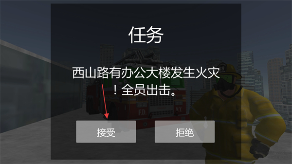 1、游戏中出现任务提示西山路有办公大楼发生火灾!全员出击,点击接受按钮承接任务。