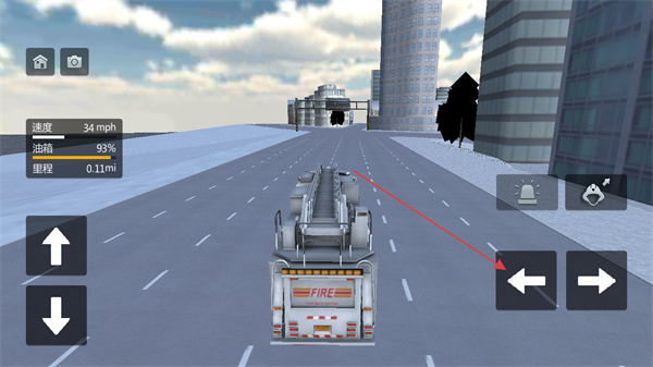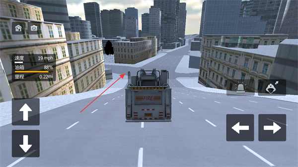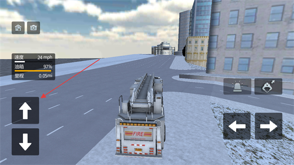 2、通过屏幕左侧的上下箭头按钮控制消防车前进或后退,留意速度,油箱,里程等信息。