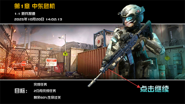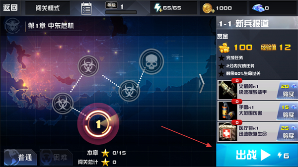 1、在关卡选择界面,如第1章中东危机的1-1新兵报道,确认关卡目标和奖励,点击出战。