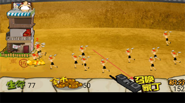 4、积累足够金币后点击召唤家丁,借助家丁抵御拆迁队进攻。