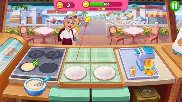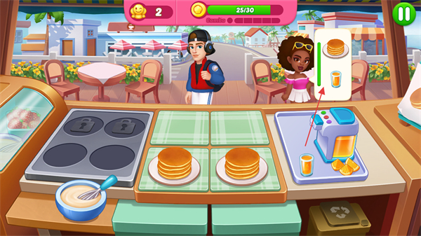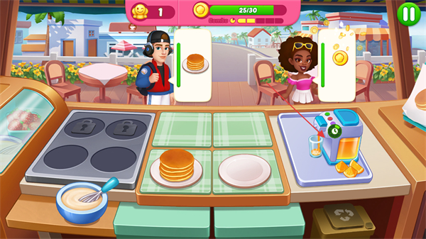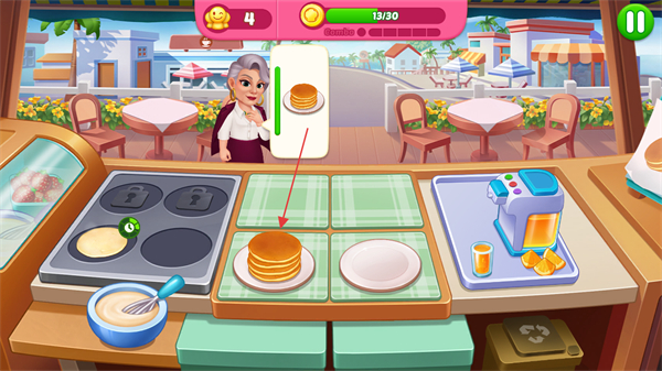 1、进入游戏,关注屏幕上方顾客头上的食物需求标识,比如煎饼,点击灶台制作相应食物。