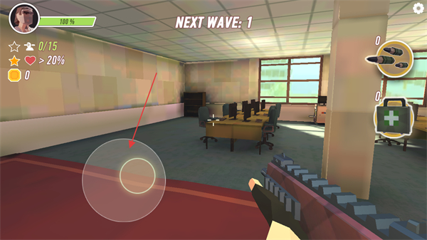 2、使用屏幕左下方的虚拟摇杆控制角色移动,在办公室内调整位置,做好迎战准备。