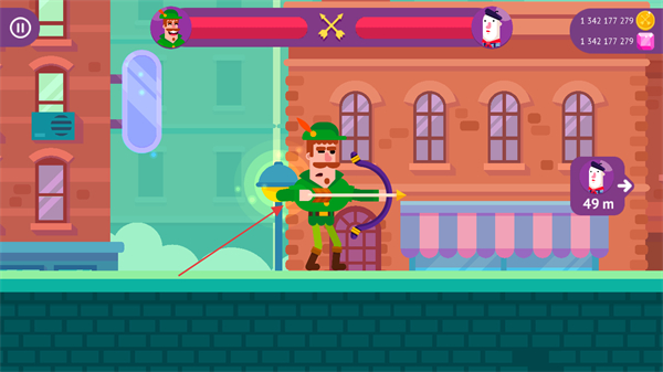 1、调整射箭角度,瞄准远处的敌人显示距离如49m,发射箭矢攻击。