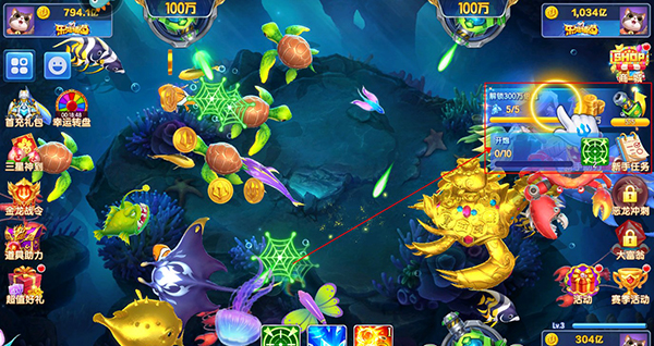 玩家进入捕鱼场后可以点击屏幕控制炮塔发射炮弹捕鱼,瞄准好价值高的鱼类将其消灭就可以获得金币。