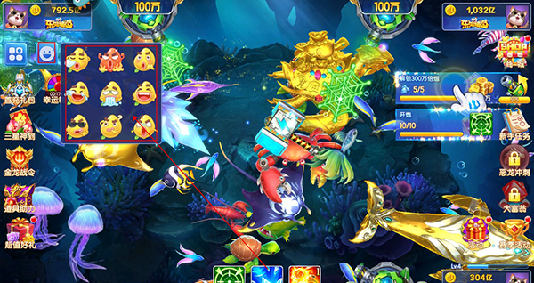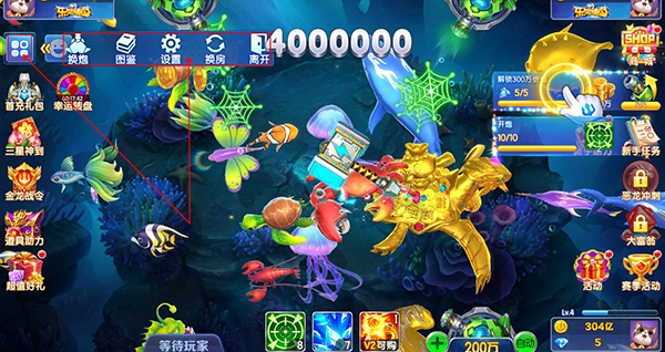 玩家可以点击左上角的四个口,打开“更多页面”,可以使用炮台切换、游戏设置、查看图鉴、切换捕鱼房间、离开房间五个功能。