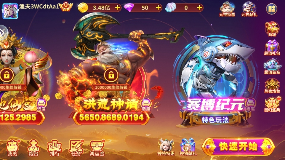 玩家在蜻蜓手游下载并登录游戏之后,可以点击右下角的“快速开始”,进入捕鱼房间捕鱼,也可以自己选择倍数场开始捕鱼