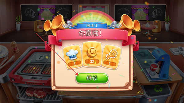 4、完成关卡1的所有顾客服务任务后,获得你赢啦的胜利提示,点击继续进入下一关。
