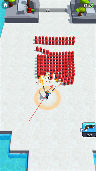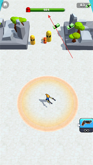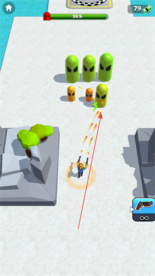 1、操控角色移动,接近红色颜色的敌人集群时自动射击,消灭敌人以推进关卡进度。