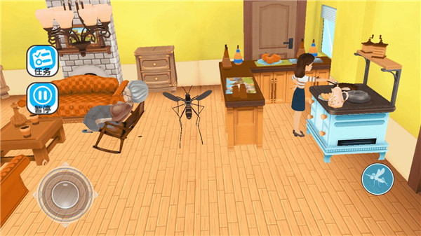 以3D画面还原家庭环境如客厅、卧室、厨房,场景细节丰富,家具摆放、人物动作逼真,让蚊子视角的吸血体验更具沉浸感。