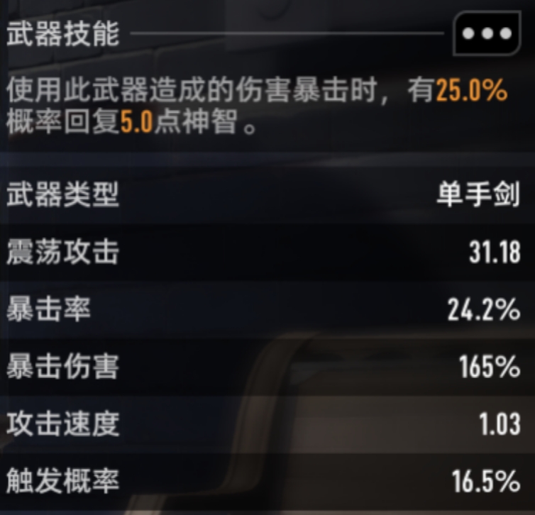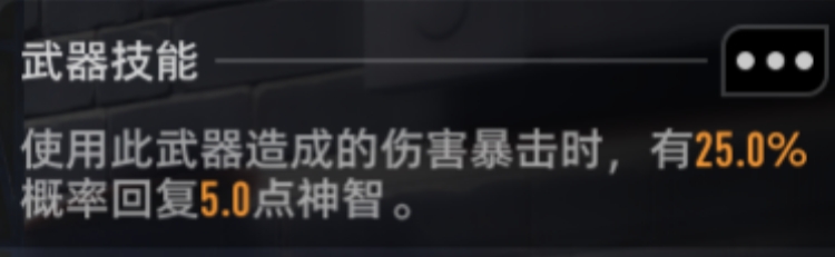 以【辉珀刃】为例,它自带的武器技能呢,就是玩家在使用此武器造成伤害暴击时,有25%的概率回复五点神智。而在游戏过程中呢,神智的设定就相当于我们常规游戏的蓝条,这是我们释放角色技能的基础,也是我们攻击敌人的核心手段之一