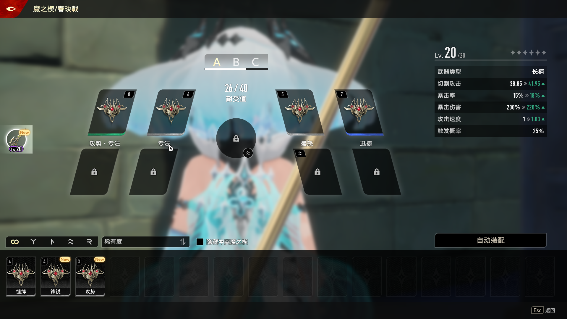 而在武器培养方面,游戏添加了魔之楔的设定。关于这个设定,这里我就通俗的解释为武器铭文(此后一律以铭文相称)玩家可以通过给武器镶嵌铭文,以达到增强属性的目的,铭文上限能够放置九枚,品质越高,自带属性就越强。