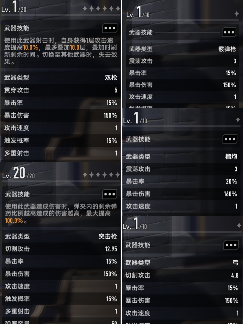 远程武器在培养机制上与近战武器并无不同,唯独不同的就是其攻击方式以及武器类型,其武器类型大致分为双枪、突击枪、散弹枪、榴弹炮以及弓,每把武器也正如我先前所说有着独属于自己的武器特性。