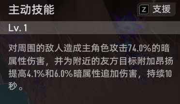 以图片中的【紫纱黑云】为例,它可以直接对周围敌人造成主角色攻击74%的暗属性伤害,并且为附近的友方目标附加昂扬状态,这可以使玩家的角色提高4.1%和6%的暗属性追加伤害,效果持续十秒!这一点上还是蛮香的。