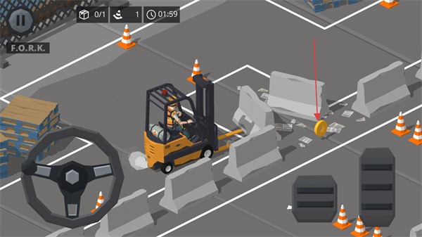 1、驾驶叉车从DOCKA出发,沿道路前往目标区域,注意躲避路锥。