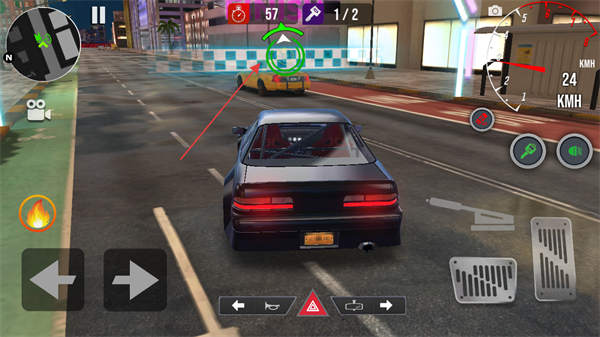 1、在起点处准备,通过左右按键控制方向,油门踏板加速,驾驶车辆出发。