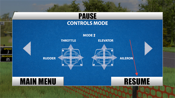 2、若进入暂停界面,可查看控制模式说明,熟悉油门、升降舵、方向舵、副翼的控制方式,点击RESUME继续游戏。