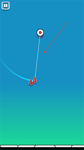 1、观察火柴人飞行轨迹,在合适时机释放飞钩,挂住上方固定点,借助飞钩摆动获得动力。