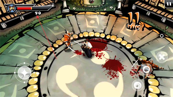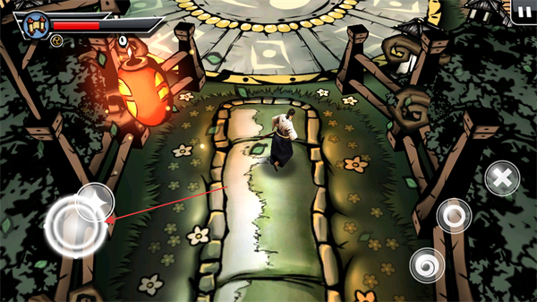 1、操控武士移动,利用左侧虚拟摇杆在场景中行走,接近敌人。