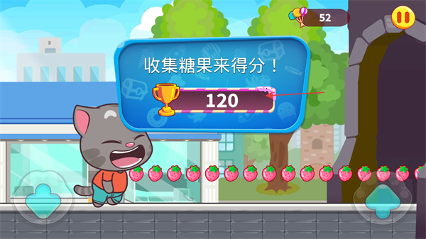1、操控汤姆猫在城市街道中奔跑,收集沿途的草莓、糖果等道具,积累得分。