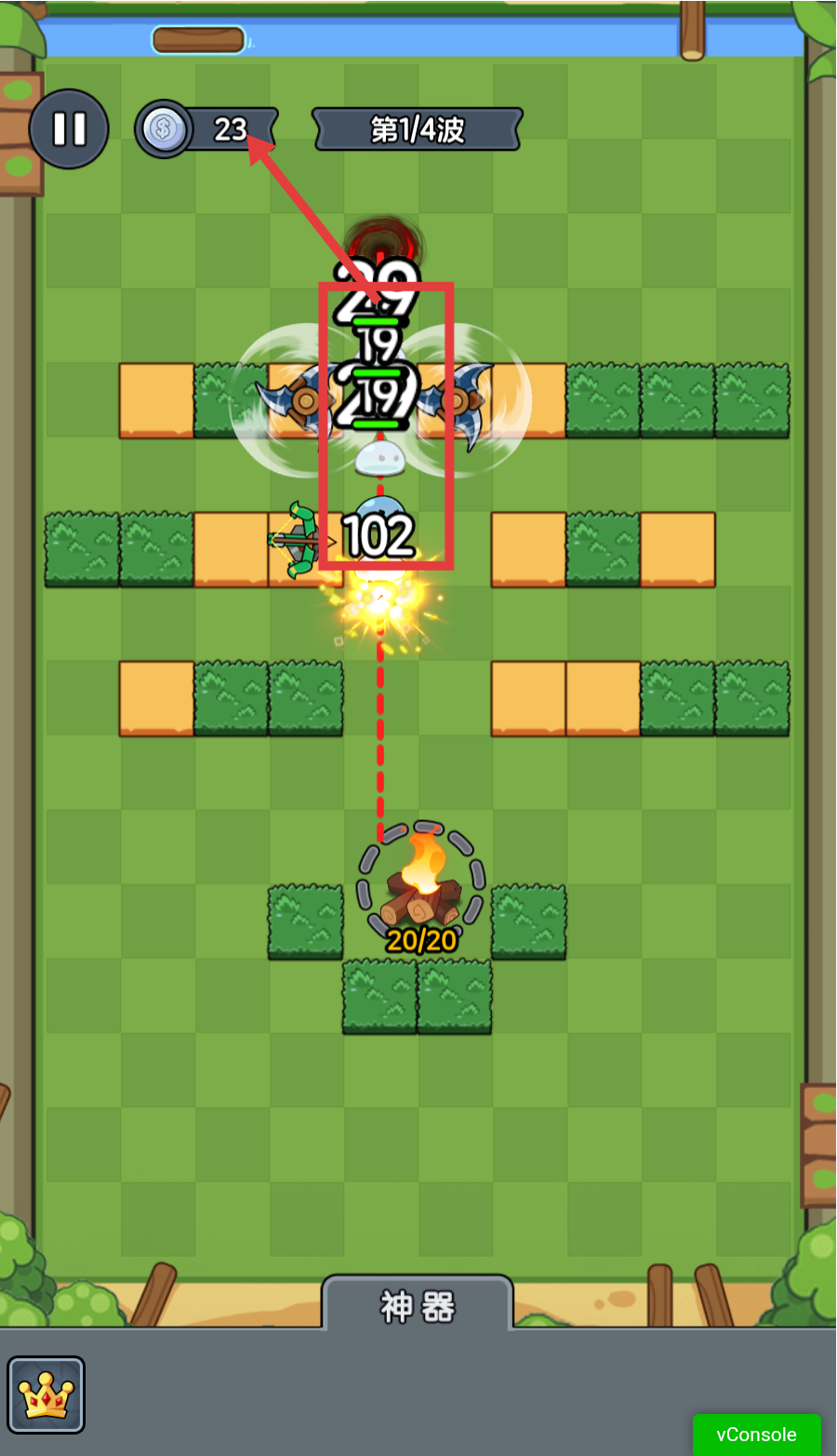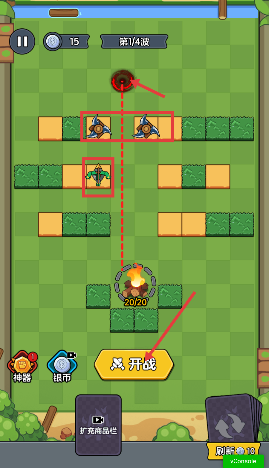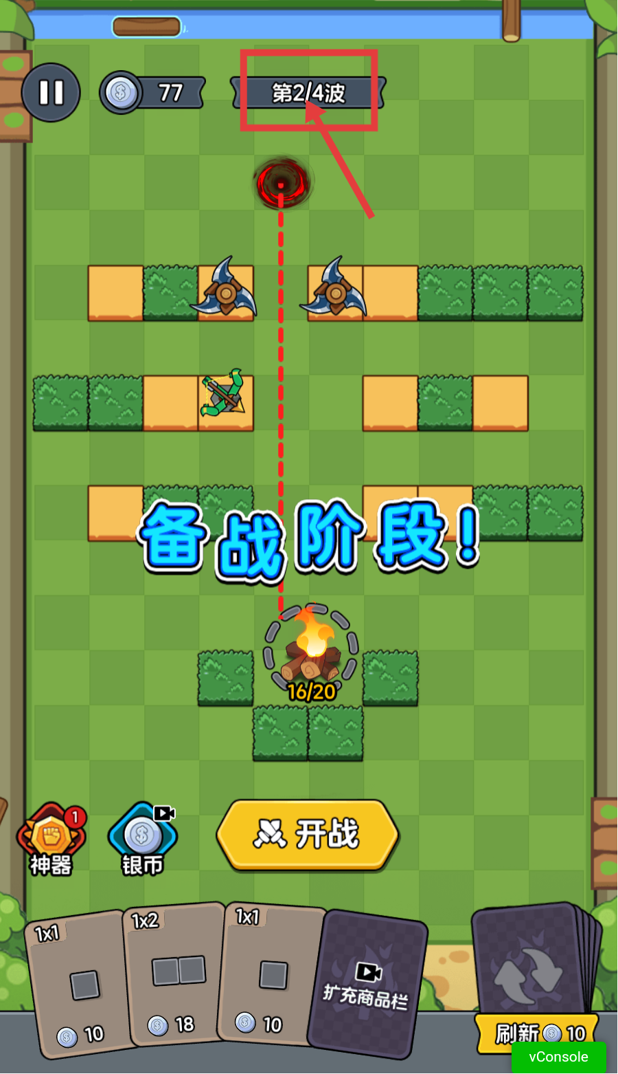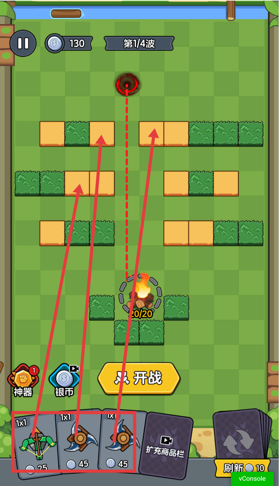 1、第1/4波时,优先用银币购买【弓箭】和【飞镖】炮台,布置在敌人路径关键位置,构建初期防御阵线。