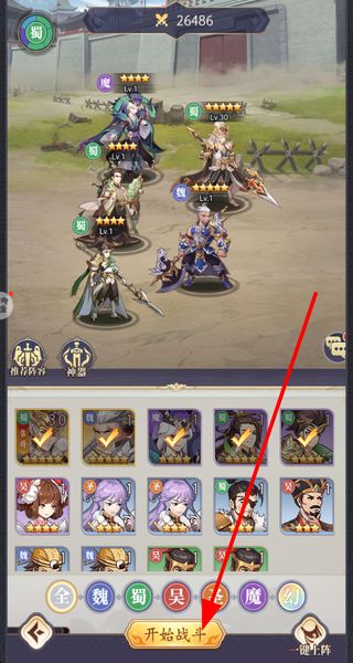 2、布置角色阵容,选择合适的武将组合,点击开始战斗,开启三国对战之旅。