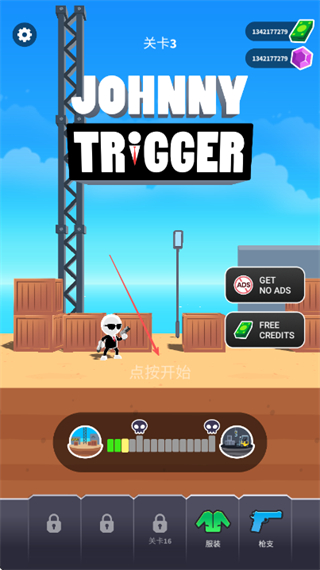 包含多种场景的关卡,通关数量越多可解锁越强的枪支,武器杀伤力随进度逐步提升,为后续闯关提供更强助力。