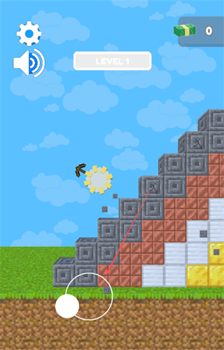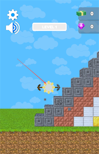 1、在Level1中,操控钻头状的挖掘工具,向由灰色、棕色、白色、黄色等方块组成的区域发射。