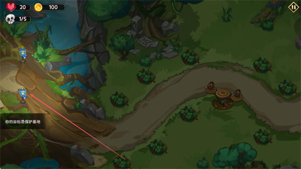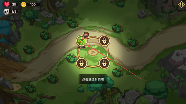 1、消耗100金币点击建造射箭塔,在路径关键处布置防御。