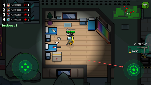 2、操控角色在房间内移动,靠近箱子获取武器资源,根据地图了解场景布局。