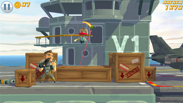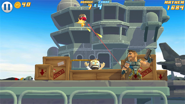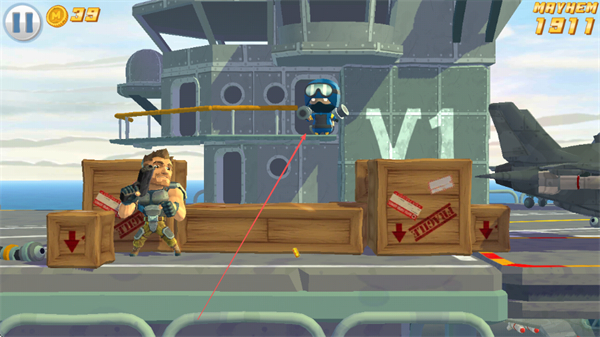 1、在航母场景中,操控角色射击敌人,命中后收集金币,积累伤害值和连击数。
