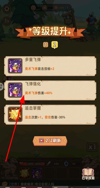 2、等级提升时选择技能,在多重飞弹、飞弹强化、追击掌握等技能中挑选,提升角色战斗力。