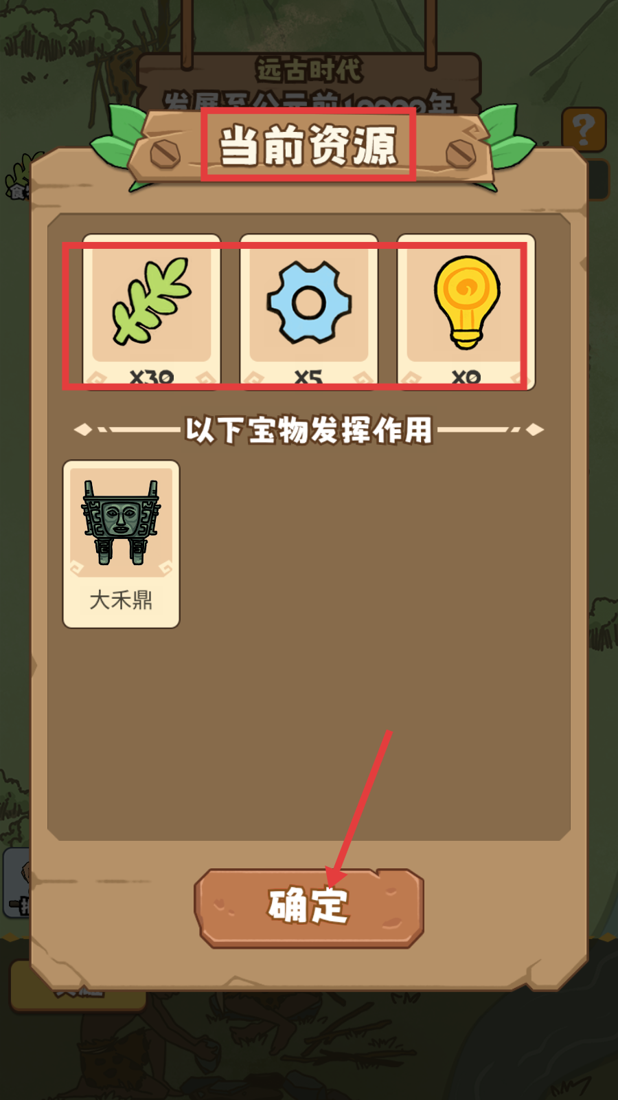 1、查看【当前资源-食物×30、科技×5、知识×0】及宝物【大禾鼎】,点击【确定】,开启资源利用与发展进程。