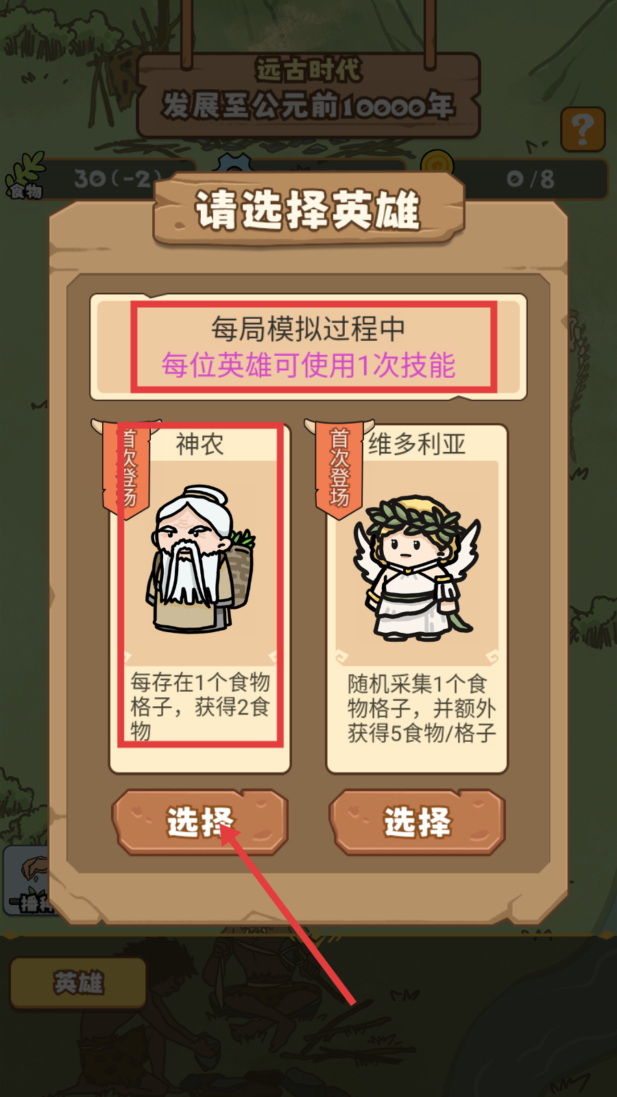 2、选择英雄【神农】,其技能为每存在1个食物格子获得2食物,每局模拟中每位英雄可使用1次技能,助力资源积累。
