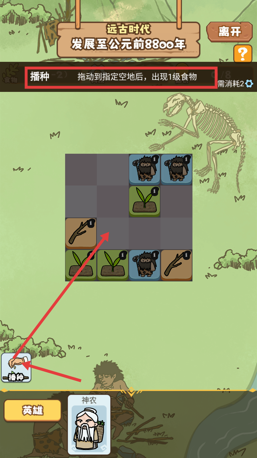 3、使用【播种】功能,拖动到指定空地后出现1级食物,消耗2科技,为远古居民提供生存资源。