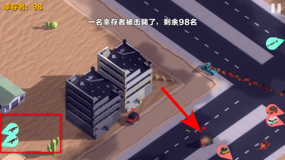 3、拾取场景中的武器道具,增强汽车的攻击能力,更高效地淘汰其他幸存者。