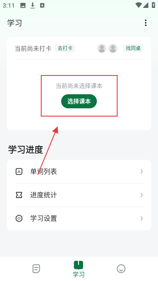 1、在学习页面,若尚未选择课本,点击【选择课本】按钮,进入课本选择界面挑选合适课本。