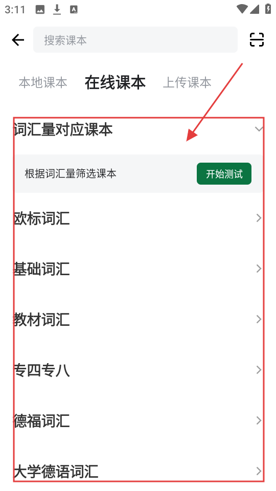 2、进入课本选择界面,有【词汇量对应课本】【欧标词汇】等分类,可根据需求选择或测试筛选课本。
