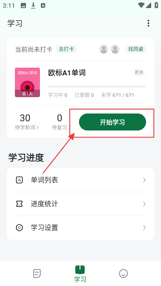 3、选好课本后,回到学习页面,点击【开始学习】按钮,即可进入单词学习界面开始学习。