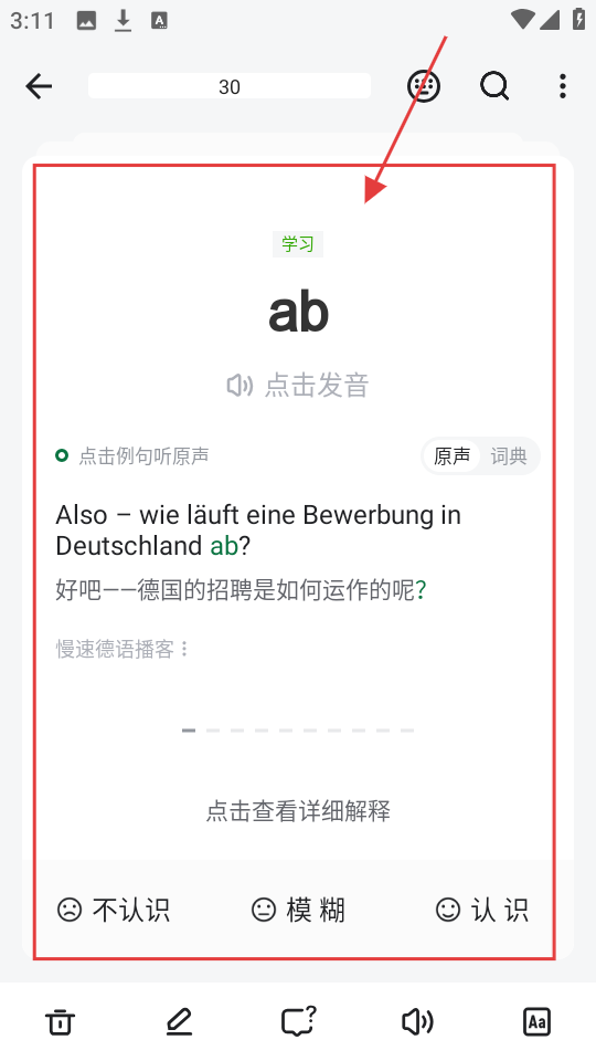 4、在单词学习界面,能看到单词、发音、例句等内容,可根据提示学习,还能标记对单词的熟悉程度。