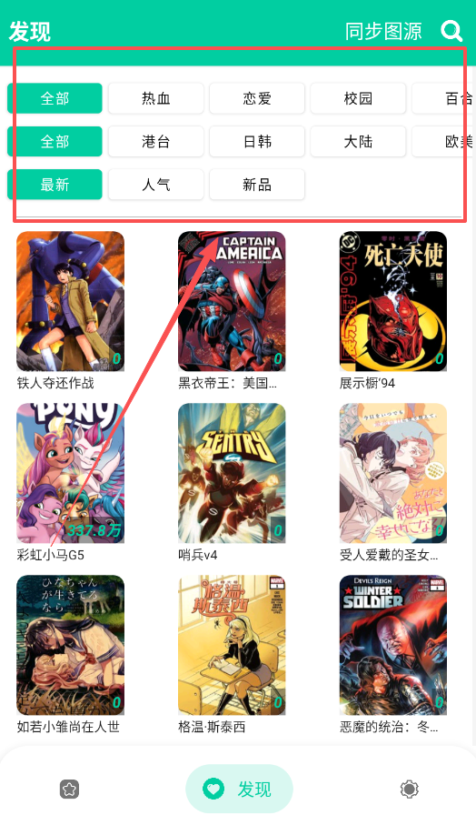 1、在主界面底部导航栏中,点击发现按钮进入漫画浏览页面,这里提供了多种筛选方式,方便你快速找到感兴趣的漫画作品。