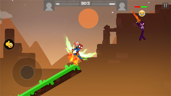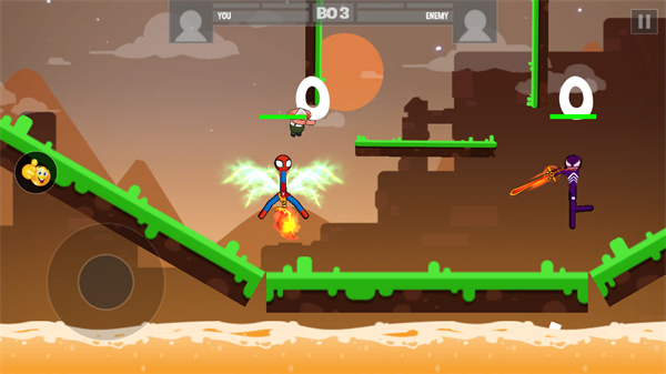 1、在场景中操控蜘蛛火柴人移动,利用武器与敌方火柴人战斗,注意走位躲避攻击。