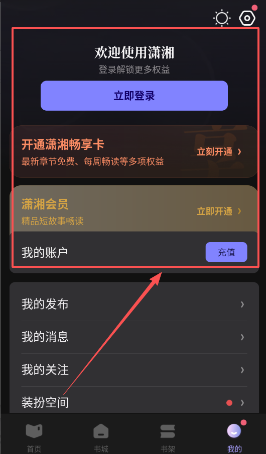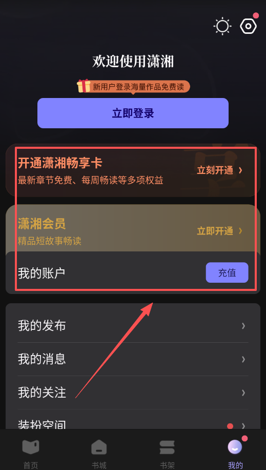 4、想要读得更多,可以考虑开通会员比如潇湘畅享卡,能免费看很多章节,同时书城里的免费和完结书库也是不错的选择。