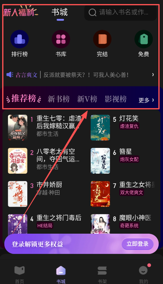 2、找书时不用怕,多逛逛书城的推荐榜和新书榜,或者直接在顶部搜索框输入你想找的书名,看看大家都在搜什么作为参考。