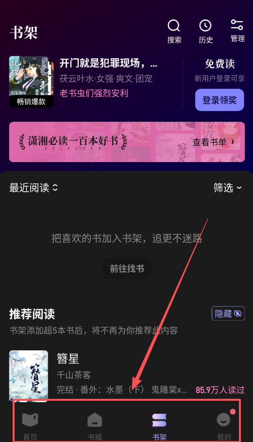 3、看到喜欢的书就果断加入书架吧,这样就不会错过更新,在你的书架页面能看到阅读记录,收藏多了推荐自然就变少了呢。