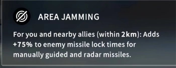 在自己2km内的队友都可以获得该特性,在受到雷达类导弹锁定攻击时增加其75%锁定时间