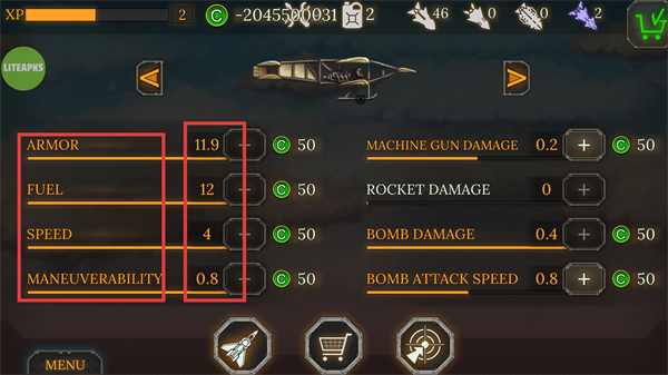 2、在属性强化界面,可消耗【50】货币提升【ARMOR-11.9】【FUEL-12】等基础属性,同时强化【MACHINEGUNDAMAGE0.2】等相关属性。