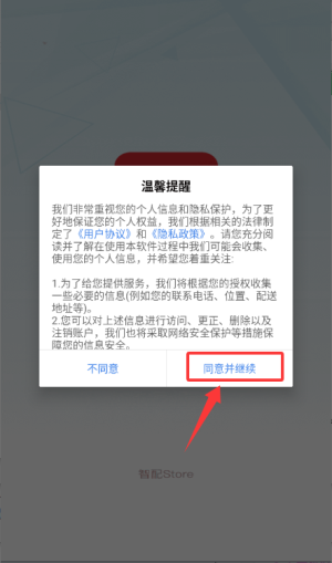 1、在温馨提示窗口点击"同意并继续",即可进入应用。